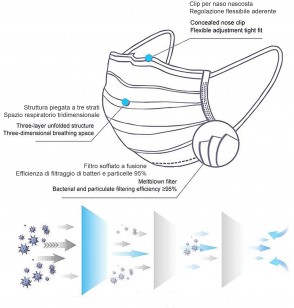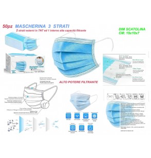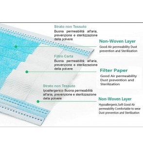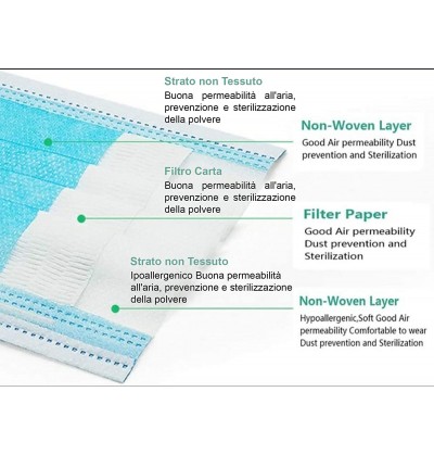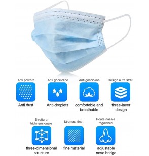 Mascherina in tessuto non tessuto ad alta capacità di filtrazione, vestibilità comoda, inodore, con 3 strati di protezione, colore blu. Gli elastici extra morbidi eliminano la pressione alle orecchie. Strato interno sensibile in tessuto morbido. Nessuna tintura, senza sostanze chimiche, delicata sulla pelle. Alta filtrazione, 99,5 BFE, 99,7 PFE a 0,1 micron. Resistente ai liquidi, senza fibra di lattice, inodore. Mascherina chirurgica a tre strati per la protezione del paziente: 2 strati esterni in tnt 1 stato interno con alta capacità filtrante I diversi strati sono mantenuti insieme da una fettuccia elastica, in grado di garantire un maggior comfort agli utilizzatori. Sul lato superiore si trova una barretta stringinaso conformabile. Ha un potere filtrante > 95%, conforme alla UNI EN 14683:2006. DISPOSITIVO MEDICO CE
